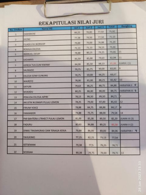 Dengan nilai 85,88 vokal group Gereja Tua Elim Kwawi mengalahkan 21 vokal group lainnya.